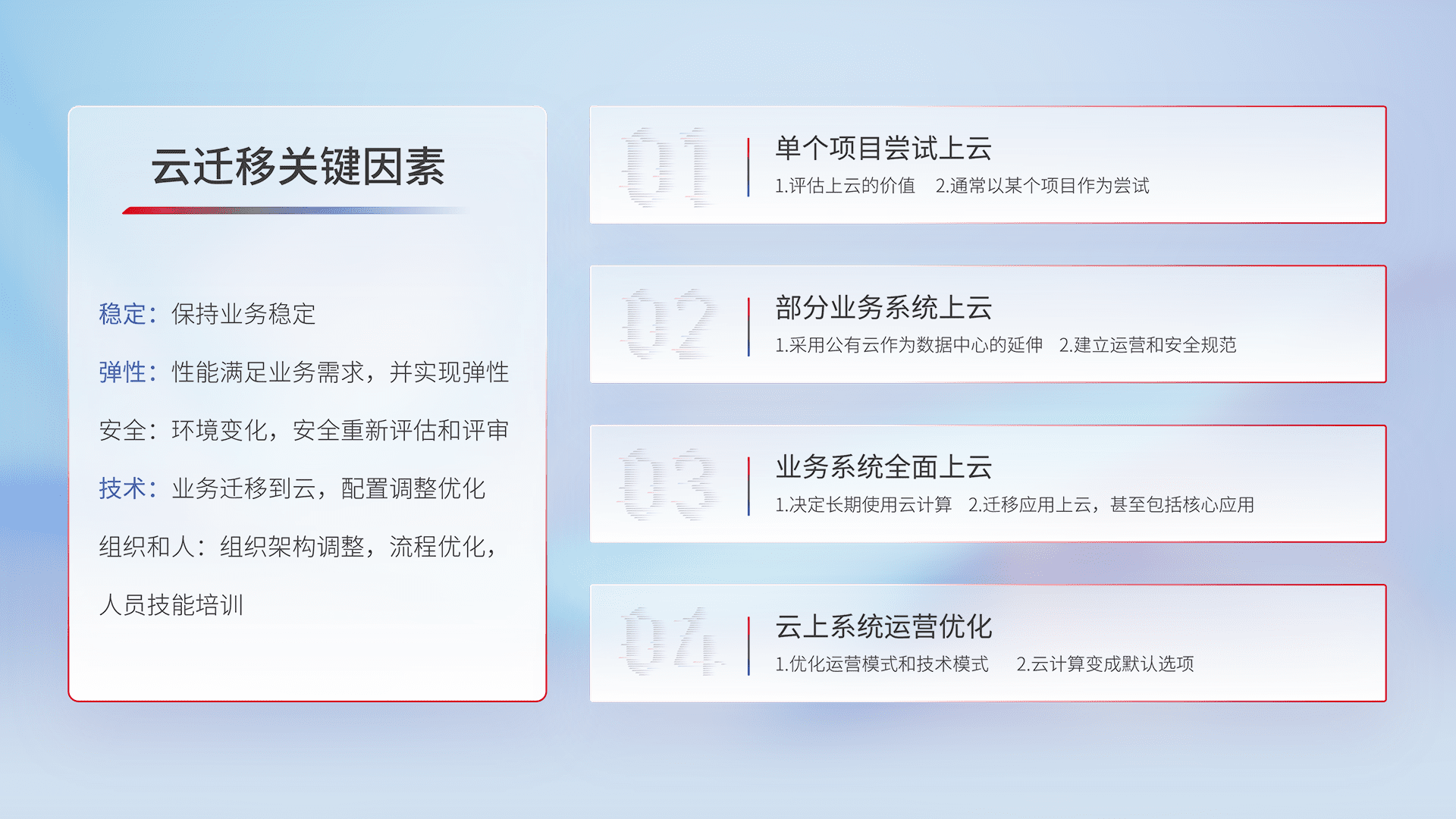 结合实际业务,,,,从规划设计、、、、云平台选型、、、云原生改造、、、、数据迁移、、、、集成交付,,,迁移全过程为客户识别最佳上云路径,,做好风险识别管理,,,设计网络架构、、、身份权限、、、安全审计合规、、操作审计、、、日志审计、、、、监控告警策略、、多站点容灾设计等,,,,对云上基础设施进行整体规划,,,,提升IT治理水平,,,,以满足弹性、、高可用、、、、高性能的需求。。。。