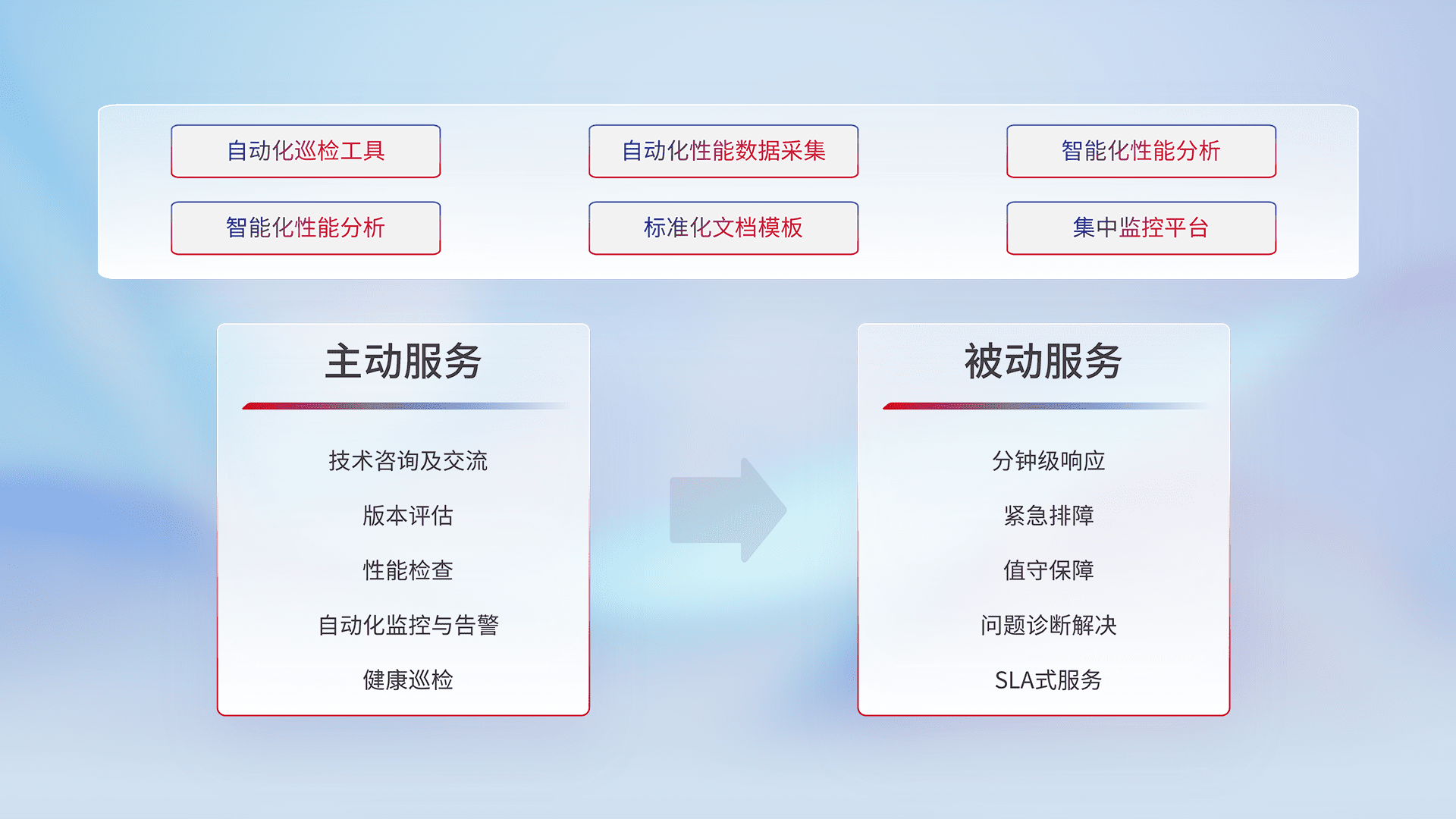 智能化工具和标准化文档,,保障服务质量,,提供主动服务(包含技术咨询、、、、版本评估、、、、性能检查、、、、自动化监控与告警、、健康巡检)和被动服务包含(分钟级响应、、、紧急排障、、、值守保障、、问题诊断解决、、SLA服务)。。